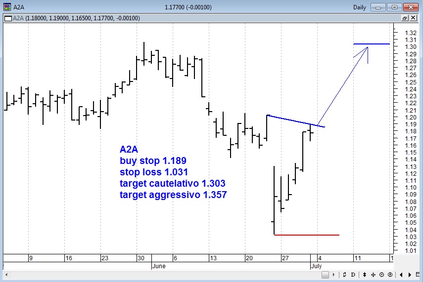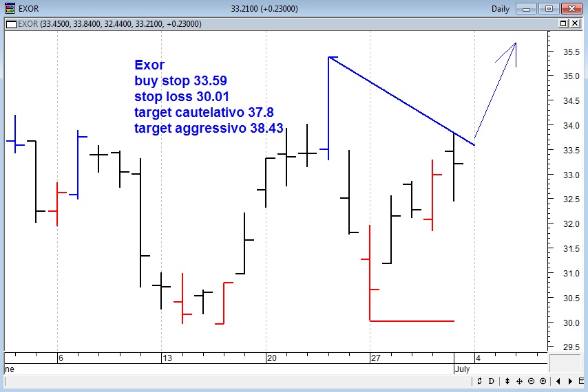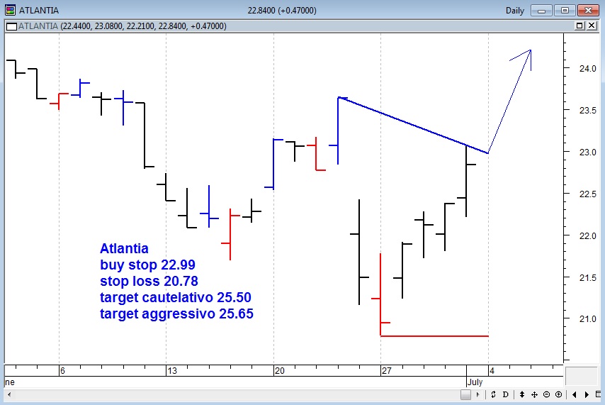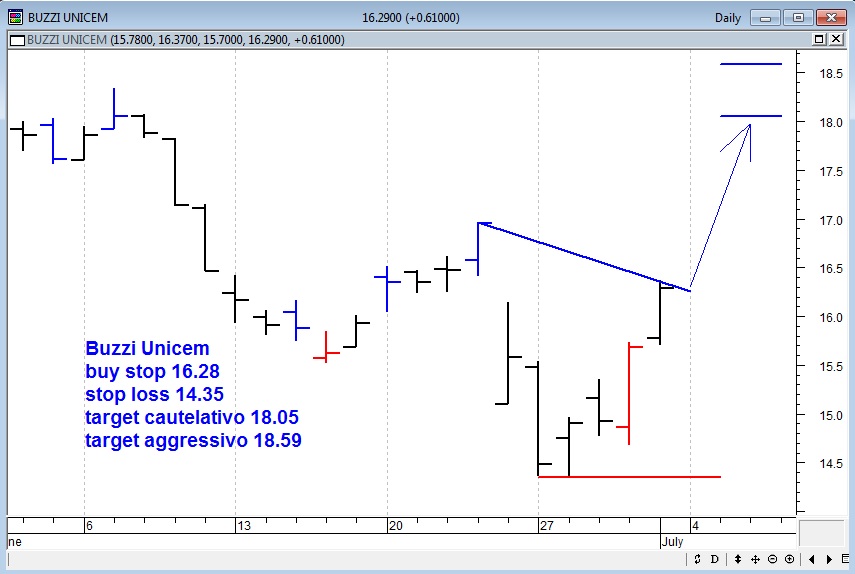 passata (forse) la tempesta della Brexit sembra voler tornare il sereno sui listini azionari. Molti titoli stanno congestionando all'interno della lunga barra nera di venerdì scorso, generando così grafici molto sporchi e di difficile interpretazione. Alcuni titoli hanno già ampiamente archiviato la caduta. Altri si stanno impostando per possibili rialzi di breve. Di seguito quattro titoli che hanno generato trendline sfruttabili. Una nota preliminare: date le forti escursioni di prezzo recenti, i livelli di stop e target sono molto lontani dai prezzi di entrata, perciò ritengo discrezionalmente consigliabile in situazioni di questo genere optare per i target cautelativi. Per ogni titolo trovate comuqnue indicati sia il target cautelativo che quello aggressivo.
