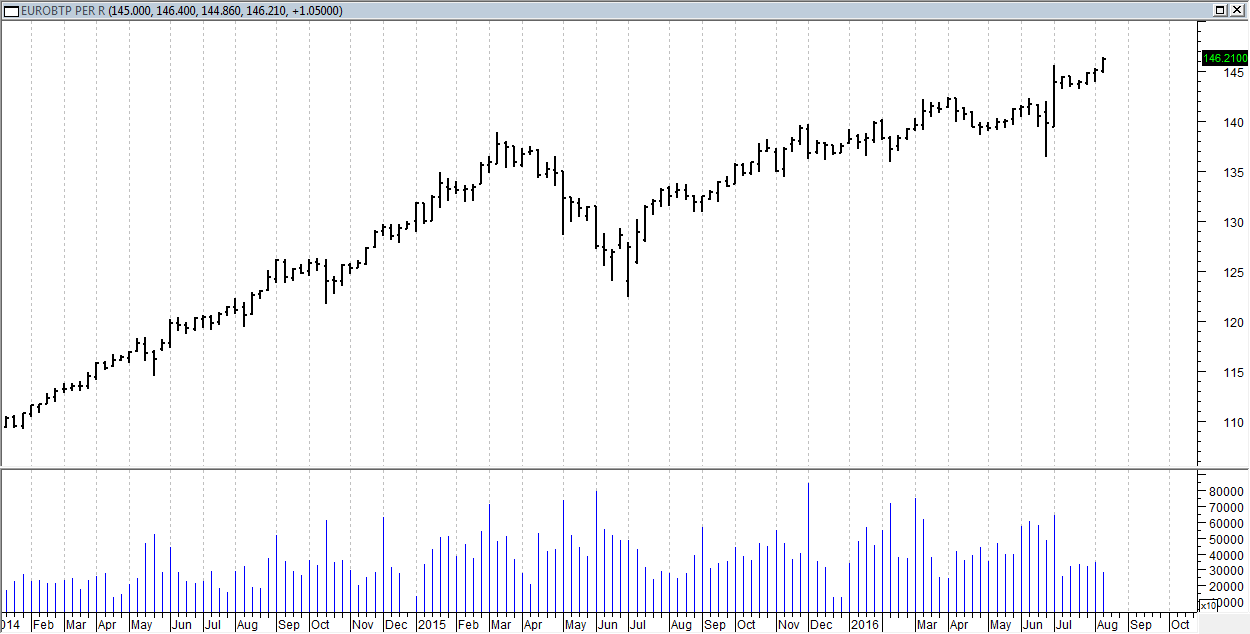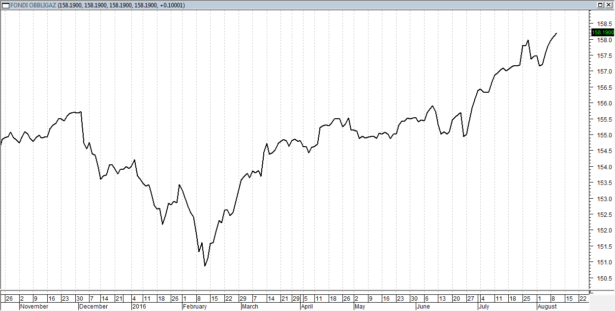 Osservando il “benchmark” dei fondi obbligazionari Fideuram registriamo una settimana in allungo al rialzo, che di fatto archivia la correzione di luglio e si porta sopra i massimi relativi precedenti superando area 158.