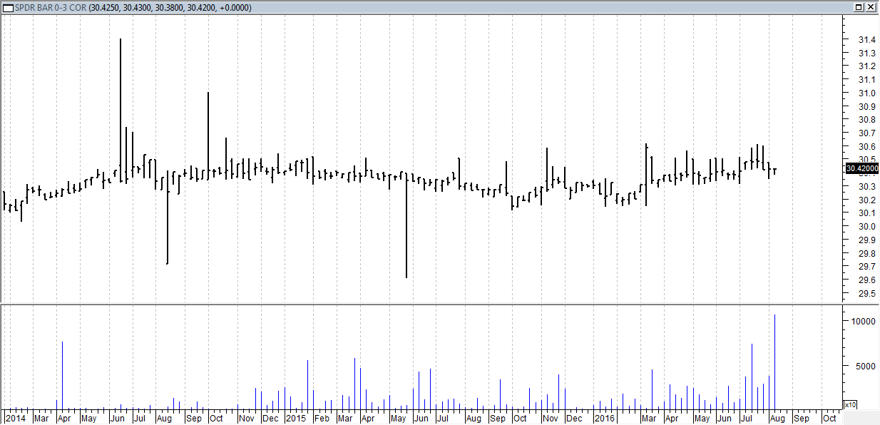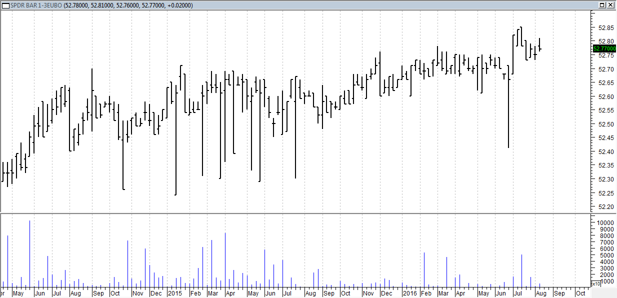 Settimana statica per l’ETF sui corporate area Euro (Spdr Barclays 0-3 Yr Cor Bond, codice Borsa Italiana: SEUC) che chiude sostanzialmente al livello della settimana precedente, come possiamo osservare anche da grafico qui sotto.