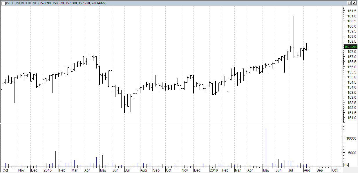 Settimana al rialzo, infine, anche per l’ETF sui covered bond area Euro (Ishares Euro Covered Bond, codice Borsa Italiana: ICOV), che prosegue la sua marcia composta e regolare verso l’alto.