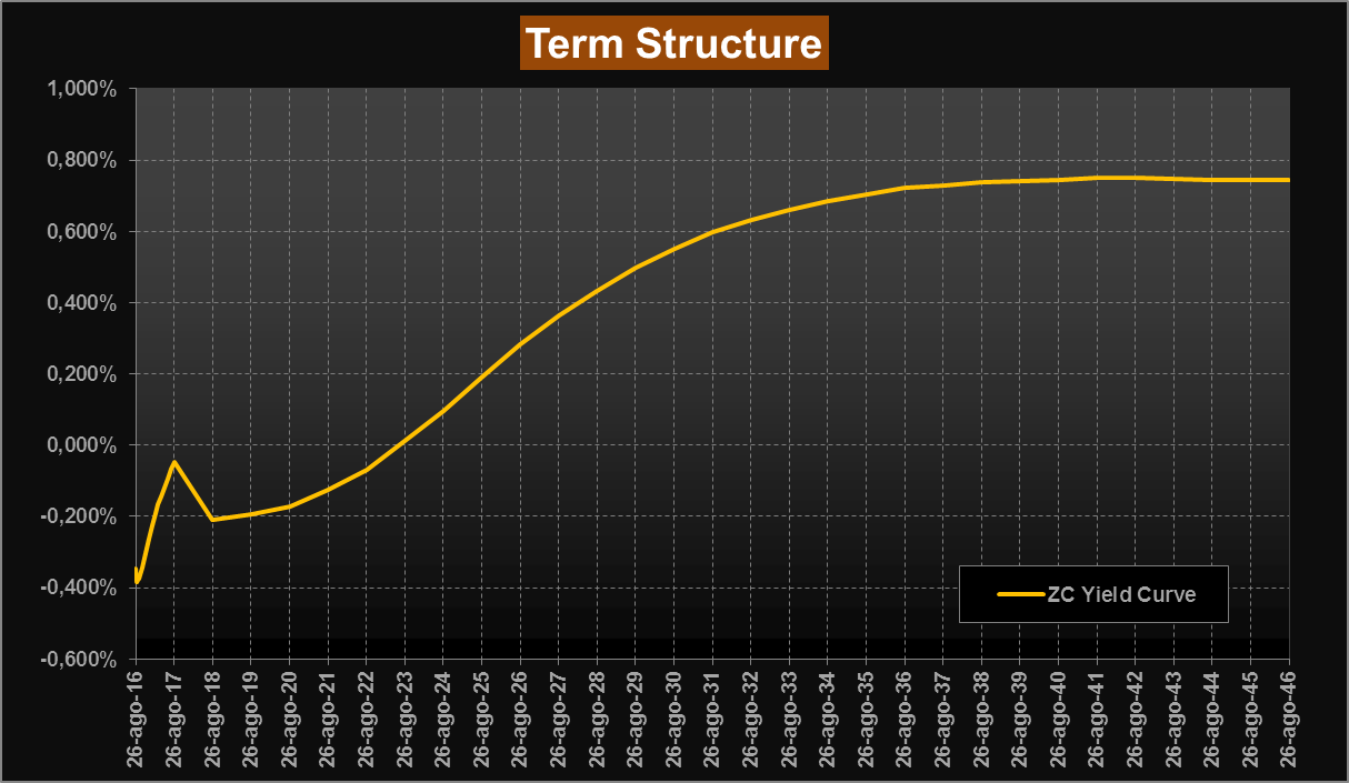 La ZC Yield Curve rimane quindi sostanzialmente invariata rispetto alla rilevazione precedente, salvo una contrazione di 5 bps sui tassi a lunga.