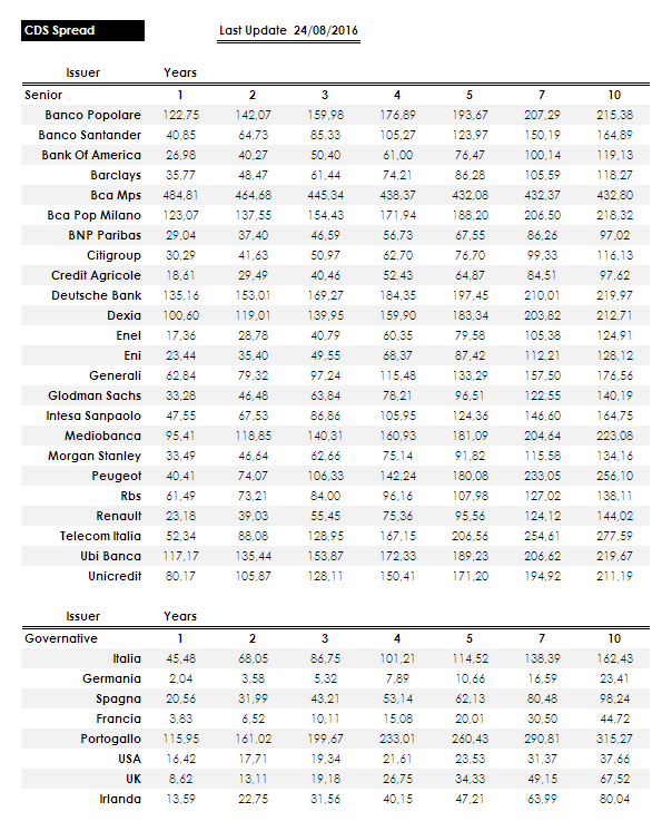 Un po’ più mossi invece i CDS, a macchia di leopardo sui bancari, con alcuni emittenti che stringono (ad es. Bco Popolare, Santander, Bank Of America, Pop Milano) e altri che allargano (ad es. Mps, Deutsche Bank), il tutto senza comunque variazioni significative, come vediamo dalla tabella qui sotto.
