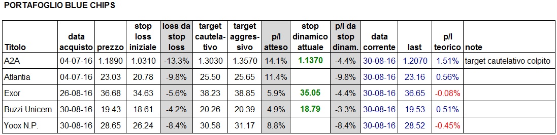 Su Buzzi ed Exor, come vedete, ci sono già stop dinamici migliorativi rispetto agli stop loss iniziali.