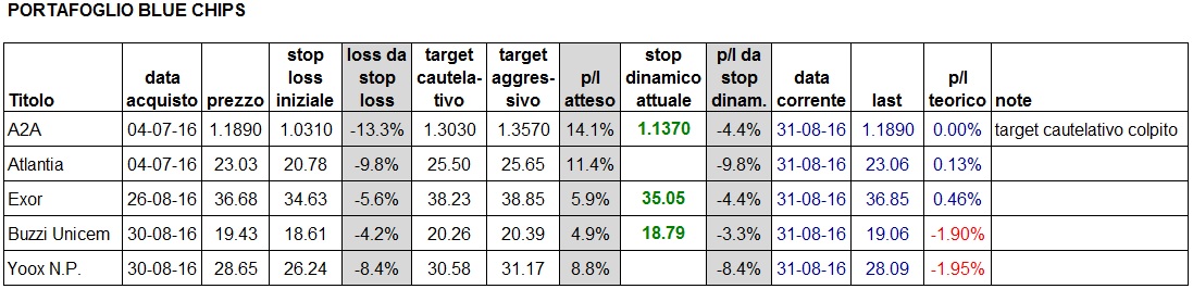 Restano ancora validi i segnali già forniti, su livelli lievemente modificati (vedi sotto). Si aggiunge Generali all'elenco dei sorvegliati speciali, e sto tenendo d'occhio Mediaset e Poste Italiane per i prossimi giorni. Ci sarebbe anche Prysmian, ma è sui massimi di periodo e mi fa paura; temo possa scaricarsi un po' prima di proseguire, preferisco sorvolare. Per i temerari basta inserire nel foglio excel che vi ho fornito a suo tempo il massimo del 24/8 come max1, il minimo del 29/8 e il massimo di oggi come max2 per avere i livelli di entrata, stop e target.