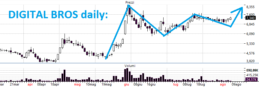 DIGITAL BROS: sopra 7,68 possibile allungo. Non è carne per i nostri denti perché illiquida, ma i lettori più scafati sanno già cosa fare se posto il grafico di seguito: