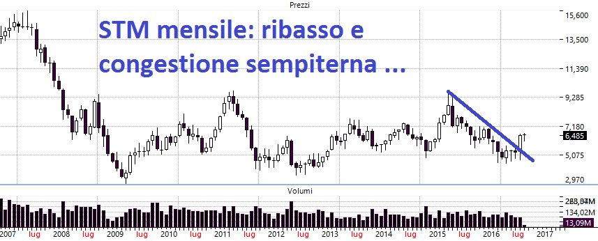 STM: sta rimbalzando dopo il ritracciamento, per scoraggiare qualche eventuale spirito bellicoso dei guerrieri posto di seguito il grafico mensile per dimostrare che STM dal 2009 non va da nessuna parte e anche ora ha rotto una mini trendline ribassista che vale come il due di coppe quando briscola è bastoni. Quindi pensiamoci sopra 999 volte prima di comprare i massimi