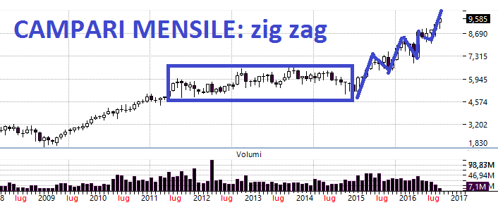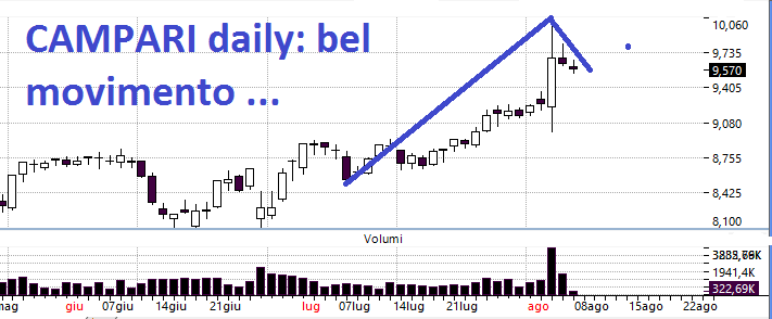 CAMPARI: il titolo tipicamente non mi piace perché non ha quella volatilità e direzionalità che ci permette di guadagnare anche se negli ultimi mesi ha fatto un movimento del 100% e butttalo via (grafico mensile). E questo dopo una congestione laterale che è durata anni. Improvvisamente c'è stata una barra molto direzionale sul daily con un leggerissimo ritracciamento, segno che chi ha le azioni in mano è più propenso a tenerle che a venderle. Stiamo attenti che un superamento dei massimi di 10,06 potrebbe rappresentare un segnale molto rialzista. Si potrebbe anticipare solo in caso di ripartenza forte e con grandi volumi.