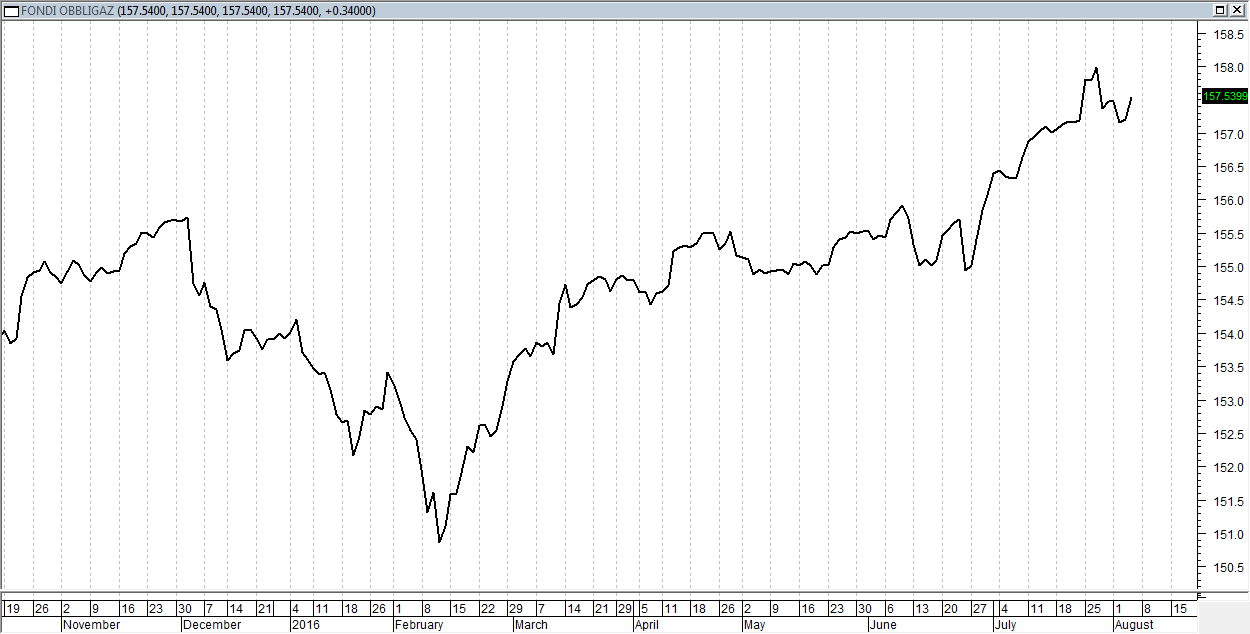 Infatti, se prendiamo a riferimento il “benchmark” dei fondi obbligazionari Fideuram, che di fatto sintetizza l’andamento del mercato obbligazionario nel suo complesso, osserviamo come dopo la veloce correzione di inizio mese le quotazioni siano in fase di ripresa, mostrando l’intenzione di riportarsi sui massimi in area 158.