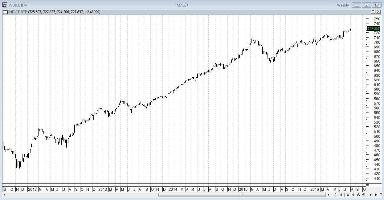 Non diversa la storia che ci racconta il grafico dell’indice dei Btp, anche in questo caso “sintesi” dell’andamento dei nostri titoli governativi. Il grafico su scala settimanale ci mostra come l’up-trend partito dai minimi di fine 2011 sia ben saldo e come le correzioni (ben poche…) siano state delle opportunità di ingresso. Tutto ciò, ovviamente, si ripercuote positivamente sullo spread (migliorando quindi il nostro Credit Risk implicito), ma negativamente sul fronte dei rendimenti, che rende ormai inguardabili anche i nostri titoli di Stato.