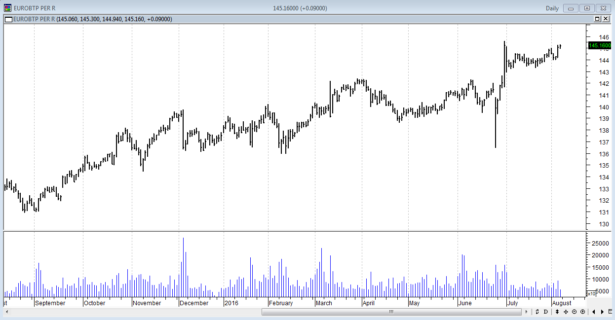 Se osserviamo solo le scadenze a 10 anni, prendendo a riferimento il grafico del Btp Future, notiamo la stessa impostazione a conferma di una situazione di sostanziale lateralità, con prezzi e di conseguenza rendimenti che si muovono in un range contenuto ormai da oltre un mese.