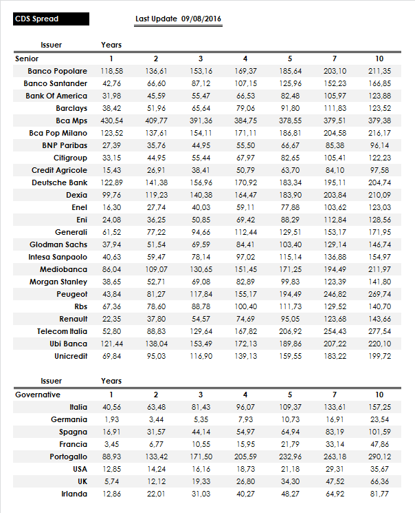 A seguito degli esiti degli stress test i CDS dei bancari hanno stretto significativamente, anche per gli emittenti non così in salute, grazie comunque ai piani di riassesto comunicati al mercato qualche giorno fa. Come mostra la tabella qui sotto, se confrontata con la precedente (si veda articolo del 27-07-2016), possiamo notare il restringimento dei Credit Risk, cui ovviamente è seguita una salita delle quotazioni.