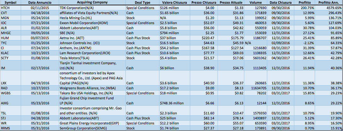 Tendenzialmente maggiore è il profitto annualizzato, maggiore è l’incertezza implicita che il processo di acquisizione vada a buon fine e di conseguenza i rischi connessi ad un’operatività speculativa sull’arbitraggio. L’operatività di arbitraggio consiste nell’acquisto dell’azione ‘target’ (colonna Symbol) e la vendita allo scoperto della società incorporante.