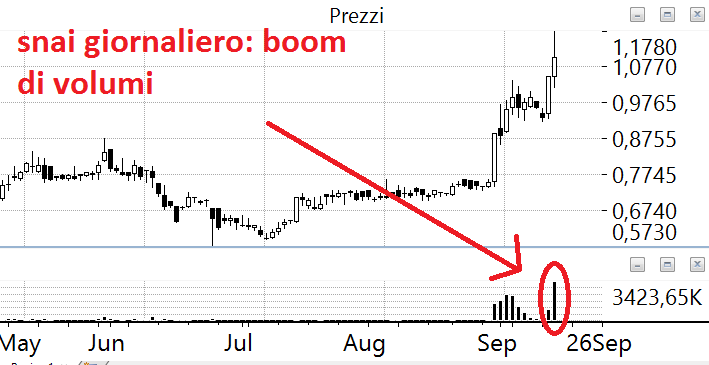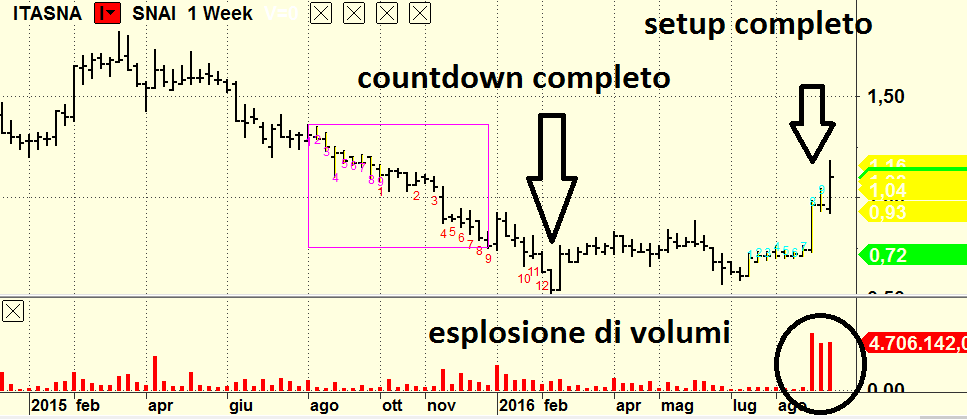 SNAI: la semestrale, presentata in agosto, è ottima in termini di crescita del fatturato (+54% sul semestre precedente), ma la redditività tarda a venire perché il bilancio è in rosso anche se di poche centinaia di migliaia di euro. Il recente exploit dei prezzi non ha ragione di essere guardando i fondamentali, con un ROE 2015 -39,99% e quindi un titolo lontanissimo dai nostri parametri. Però sul grafico settimanale vediamo un bel countdown rialzista del titolo e un set up rialzista ultimato con volumi stratosferici. Vediamo che fa ora, ma se dovesse fare quello che cerchiamo noi (uncino o congestione) una puntata vale la pena.