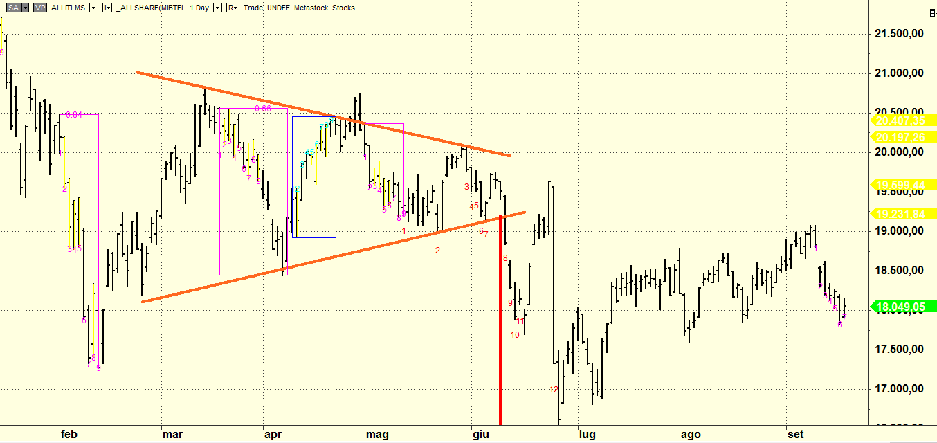 A corredo dell’articolo di ieri, scartabellando sui workspaces stamattina di Multicharts ho recuperato questo grafico che ho pubblicato sul sito poco prima della Brexit in cui si vede la proiezione (rossa) della base del triangolo (arancio). Anche se la proiezione dell’obiettivo (il punto più basso della retta rossa) è stata movimentata non si può dire che l’evento fondamentale (Brexit) non abbia rispettato il pattern tecnico (proiezione della base del triangolo). Questo per dire che in questo fortunato caso (l’ultimo ?) forse l’analisi tecnica non era morta del tutto.