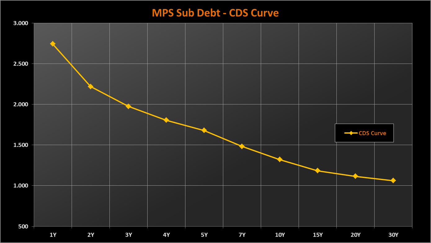 Le altre sei emissioni, quotano tutte con rendimenti intorno al 30%, scontando quindi il rischio di conversione in modo abbastanza esplicito. La curva dei CDS, pur con un modesto restringimento, rimane inclinata negativamente, come si vede dal grafico.