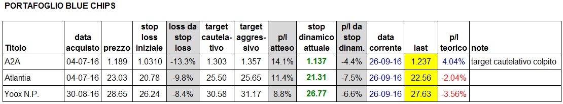 Resiste abbastanza bene il nostro portafoglio: A2A perde qualche tick, Atlantia ne recupera due rispetto alla chiusura di venerdì. Male Yoox, che sembra diretta verso sud. Portafoglio aggiornato al close di oggi: