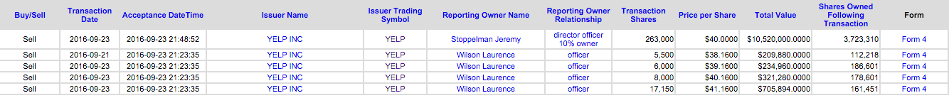Analizzando i recenti filling SEC mi sono imbattuto in una transazione che merita un'approfondimento: Jeremy Stoppleman CEO e proprietario al 10% di Yelp Inc. (NYSE: YELP) ha acquistato tra giovedi 22 e venerdi 23 un totale di 263’000 shares a $40,00 caduna per un controvalore di $10’520’000.