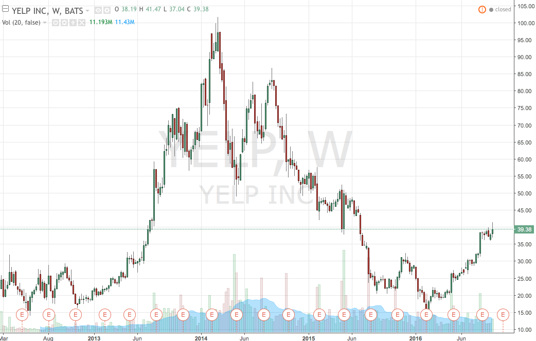 Da sottolineare il fatto che il titolo è gia cresciuto di oltre il 150% dai minimi di febbraio dove ha toccato la soglia di $15 per azione. Vero anche che il massimo storico si attesta oltre i $100 e ce ne vuole prima che il titolo torni a sfiorare il suo limite superiore (se mai questo possa accadere). In ogni caso sembra che yelp abbia preso un bel trend e che secondo gli 'insider' il titolo sia destinato a crescere ancora. Certo non è semplice prevedere quanto a lungo una un trend si questo tipo possa effettivamente andare avanti. Data la notevole volatiltia del titolo consiglio solo -nel caso lo riteniate- di operare con molta cautela.