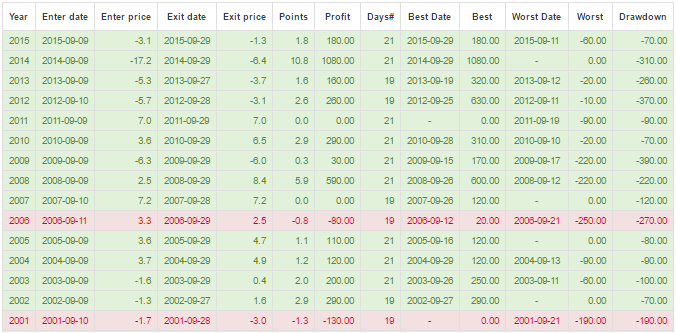 Da notare un buon 87% di successi negli ultimi 15 anni, considerando la finestra stagionale ipotizzata. Ma soprattutto è da notare all’interno della colonna Worst (penultima) l’esiguità delle massime perdite, così come è da notare all’interno della colonna Best (quartultima) la forza dello spread sulla base dei massimi profitti ottenuti all’interno della finestra stagionale. Tutto ciò ancora più specificatamente, come accennavo, negli ultimi 4-5 anni.