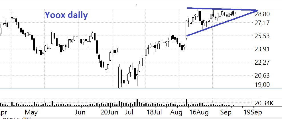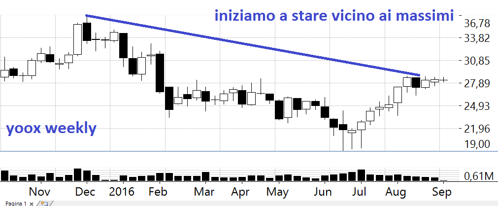 YOOX: non mi piace trattare titoli che non abbiano flussi reddituali interessanti con un ROE superiore almeno al 10%. Dopo la fusione tra yoox e net a porter se anche il fatturato è esploso nel primo anno dopo la fusione (+30%) in realtà a livello reddituale siamo sempre in zona Cesarini con un ROE del 2,62% e un ROI del 3,52%. Però a livello tecnico il triangolo in corso è un amore e la faccia sul grafico mensile è quella del bottom up in corso. Il ragionamento a livello fondamentale è semplice: se il management prima della fusione faceva numeri d’oro è altamente probabile che li torni a fare ora con un gioccattolino più grosso tra le mani.