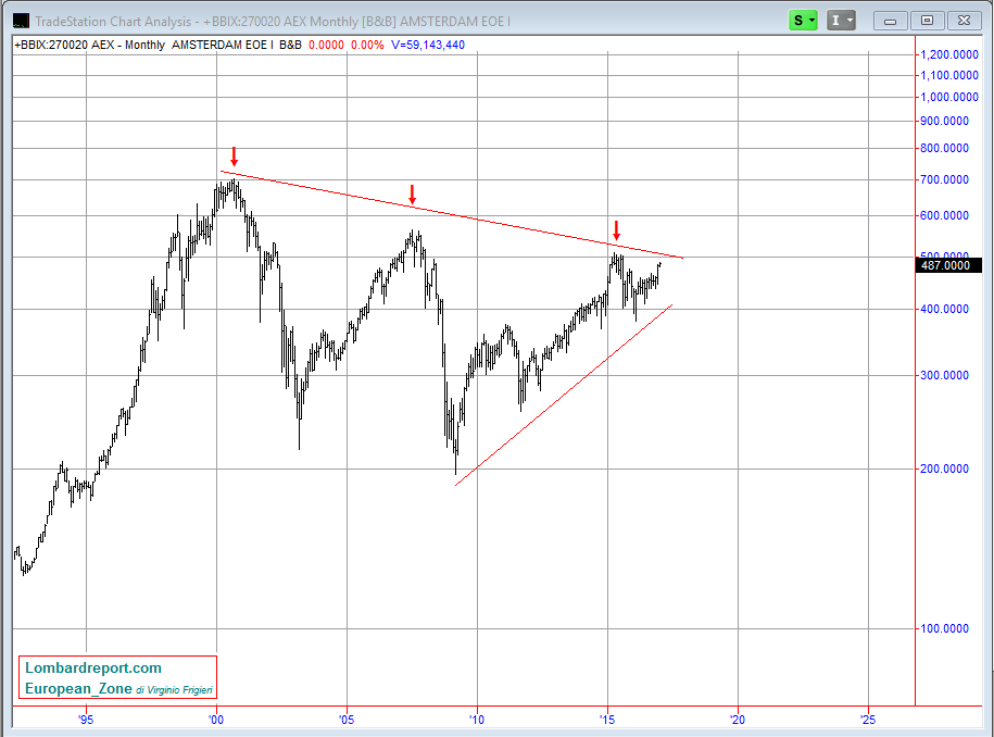 Il sistema politico olandese è un complicato guazzabuglio di partiti e piattaforme rivali e la questione centrale sarà se i partiti tradizionali riescono o meno a mettere assieme una coalizione che mantenga il controllo legislativo. Come risponderà il mercato è difficile dirlo... l'indice olandese dal 2009 ad oggi ha messo a segno un buon rally rialzista che però è ancora inquadrato in un trend ribassista di più lunga durata e ad oggi abbiamo tre bei massimi significativi decrescenti...