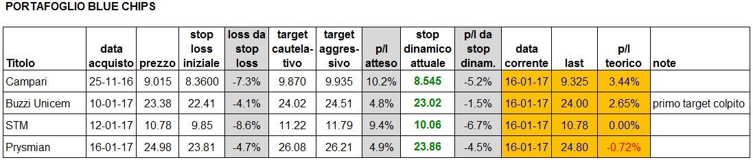 È infatti entrato il segnale buy su Prysmian, per il quale lo stop loss si è già lievemente alzato rispetto al valore segnalato ieri. Ecco il portafoglio valorizzato alla chiusura di oggi: