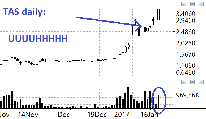 TAS: che dire di questa azione ? ogni volta che scriviamo la consigliamo anche se non possiamo inserirla nel portafoglio ufficiale del sito per le note ragioni. Ora è in fase di avvitamento al rialzo e quindi non è sano comprarla, a meno che uno non compri per una operazione di uno massimo due giorni. Chi è a bocca asciutta aspetti se non altro un po’ per entrare che faccia un uncino o una congestione.