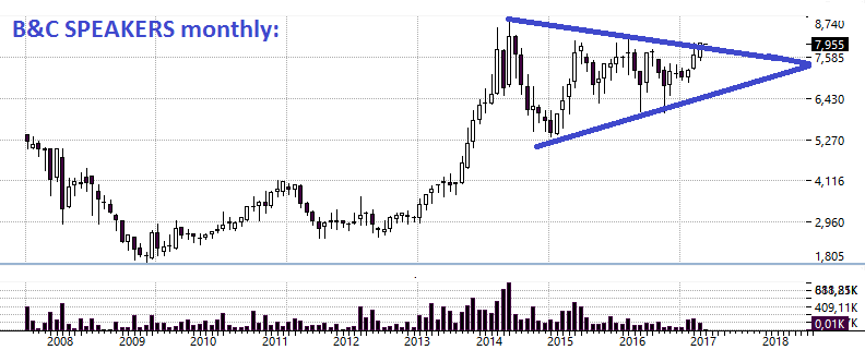 B&C SPEAKERS: valore fondamentale DCF di 8,5 euro, si tratta di uno dei pochi titoli dove batte il momentum e tecnicamente è sottovalutato ( prezzo di mercato a sconto rispetto al prezzo DCF). A livello di grafico mensile sta disegnando un triangolo simmetrico sui massimi assoluti, triangolo che sta per essere rotto. Capitalizza 87 milioni di euro, quindi davvero poco ed è normalmente illiquido. Dare un buy su questo titolo significa farlo volare di oltre il 10% però come segnalazione (per le tante "reclute" del report vedete cosa significa "segnalazione") deve assolutamente essere dato.