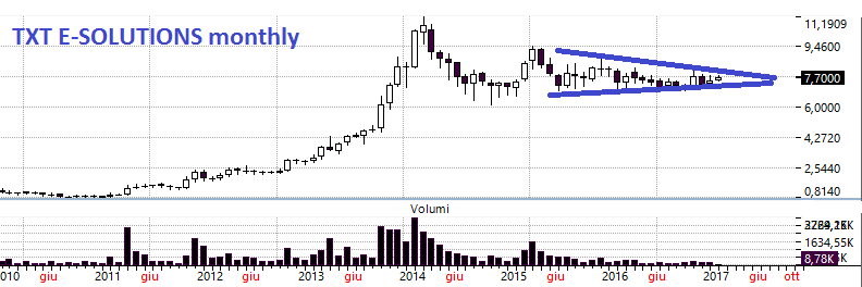 TXT: valore fondamentale DCF anche in questo caso di 8,5 euro e quindi insieme a B&C Speakers è un titolo ormai raro sul nostro mercato. In più ha un pattern tecnico ancora più bello rispetto a quello di B&C Speakers ovvero una congestione stretta orizzontale che fa voglia. La capitalizzazione è minima, poco meno di 100 milioni di euro