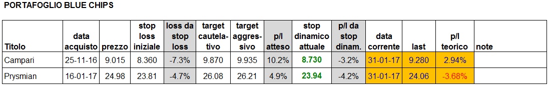 altra giornata pesante sul nostro listino, e come prevedibile ci hanno abbandonato altri due titoli, non a caso due banche. BPER e banco BPM hanno infatti raggiunto i rispettivi livelli di fuga. Perdita contenuta su BPER, con rammarico per il fatto di aver raggiunto il primo target ma non il secondo. Perdita più significativa su BPM, ma nulla di irreparabile.