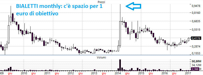 BIALETTI: ha un ROE 2015 del +30,53% e un fair value DCF di 0,30 e quindi è correttamente prezzata. Ma sappiamo che se è meglio comprare il momentum quando è sottoquotato il momentum prezzato il giusto non gli impedisce di raddoppiare. A livello tecnico siamo nella fase di rottura della base di un bottom up molto lungo e quindi molto potente. Titolo da seguire con grandissima attenzione anche se al nostro livello conviene aspettare che ci sia un po' di "persistenza" al rialzo prima di comprare nella fase più bella ovvero quando i prezzi volano.