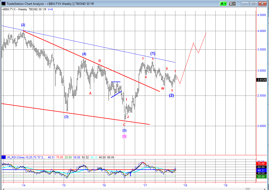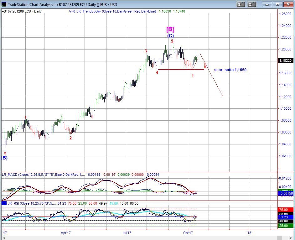 Il Dollar Index prosegue nella sua correzione al ribasso della precedente onda 1 ed una volta completata l'onda 2, l'onda 3 produrrà un significativo progresso che diventerà ben evidente verso l'inizio del 2018. Per ora sarà il superamento del massimo di onda 1 a 94,267 a darci la sicurezza che l'onda 3 sta lavorando.