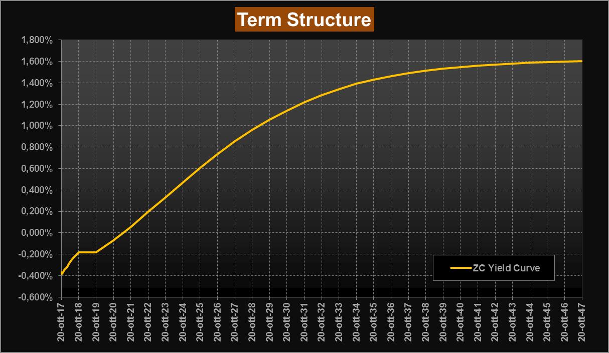 Lieve contrazione dei rendimenti questa settimana, con la ZC-Yield Curve che stringe un po’ portandosi in area 1,60% per i rendimenti a lunga (10 bps in meno rispetto alla precedente rilevazione). Anche la parte a breve stringe di qualche basis point ma in maniera meno accentuata rispetto ai tassi a lunga; la conformazine della ZC-Yield Curve continua comunque a fornire indicazioni su attese per una politica monetaria BCE compiacente anche nel 2018. Stabile infine anche l’inclinazione della curva che si conferma positiva anche sul tratto a lunga.