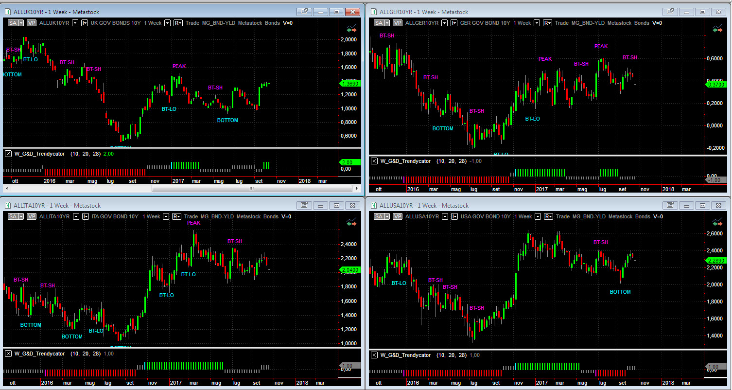 Osservando – a livello di analisi integrata – le curve dei rendimenti dei benchmark decennali dei principali mercati, si osserva una correzione della tendenza di ripresa al rialzo dei rendimenti (per cui prezzi dei bond in discesa). Dopo la prima gamba al rialzo siamo ora in una fase di assestamento/ritracciamento più marcata su Bund e Btp che non su Gilt o Treasury. La view e l’ipotesi comunque non cambia al momento: la ripresa del trend primario ribassista sui bond è in fase di sviluppo.