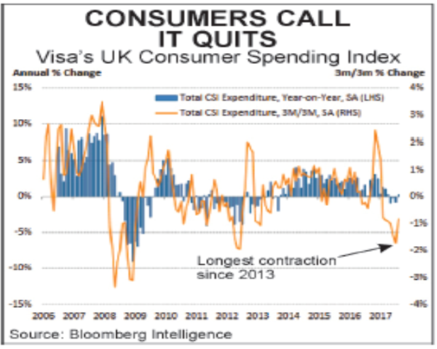 "Gli acquisti discrezionali della famiglia come abbigliamento e casalinghi, sono stati particolarmente deboli, esacerbando la fragilità della prospettiva economica." (ft, 8/7/17) Secondo il Financial Times, "la Gran Bretagna non è riuscita a riguadagnare slancio economico dopo un rallentamento della crescita all'inizio dell'anno."