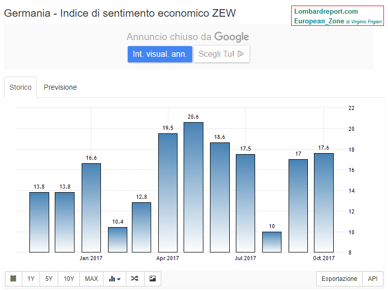 L'indice Zew è salito da 17 a 17,6 in ottobre ma sotto le attese degli analisti che si aspettavano un ritorno tra 19 e 20 punti. Anche la fiducia dei consumatori flette leggermente tornando a 10,8 il valore di luglio dal precedente 10,9.