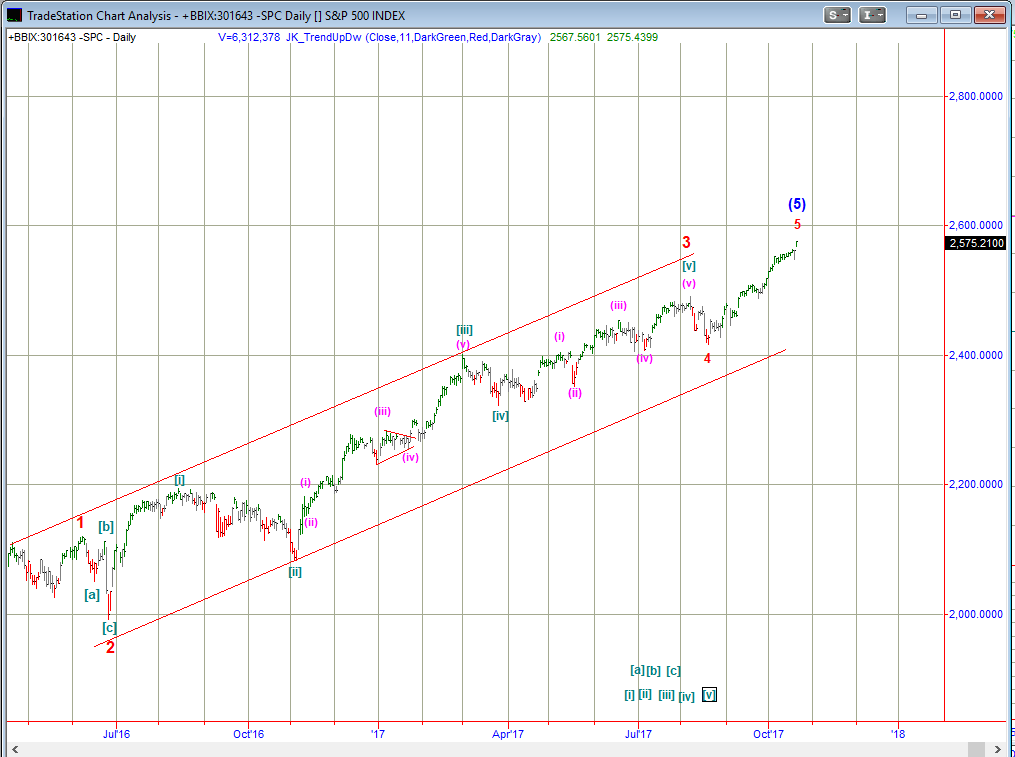 Il Dow Jones sta tracciando le ultime subonde di un potenziale thru-over del canale di trend di livello minore si sta portando a ridosso della trendline del canale di grado primario. Gli indici azionari di taglia più piccola hanno ritardato la spinta verso l'alto del Dow ed anche il Nasdaq Composite venerdì ha realizzato un nuovo massimo non confermato dal Nasdaq100. Anche le suddivisioni su S&P500 stanno acquisendo chiarezza e il massimo di venerdì ha già le carte in regola per poter considerare terminata l'onda 5... poi naturalmente servono conferme ma quello che emerge è che di questo passo ben difficilmente il toro reggerà fino a primavera.