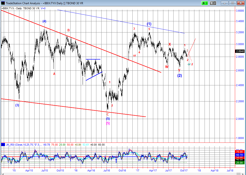 I Bond trentennali del Tesoro americano, sembrano ormai avere imboccato l'onda (3) che sui rendimenti porterà ad un forte aumento dei rendimenti ben al di sopra del 3,25%. I prezzi al contrario scenderanno di brutto con un primo target sotto 143. Lo scenario alternativo è che l'onda 2 stia ancora suddividendo e manchi quindi ancora una gamba al rialzo.... ma lo scenario generale non cambia.