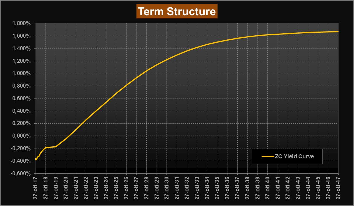 Nuova salita dei rendimenti questa settimana, con la ZC-Yield Curve che allarga un po’ portandosi oltre area 1,65% per i rendimenti a lunga. Stabile invece la parte a breve, che rimane di fatto invariata. Ovviamente sono piuttosto alte le attese per la riunione BCE di giovedì, in cui probabilmente avremo riferimenti al c.d. Tapering; al momento – ammesso che il mercato stia scontando dichiarazione nette da parte di Draghi – ne risente maggiormente la parte a lunga rispetto a quella a breve, la quale rimane orientata ad una politica monetaria BCE compiacente anche nel 2018. Sempre stabile, ormai da diverse settimane, l’inclinazione della curva che si conferma positiva anche sul tratto a lunga.