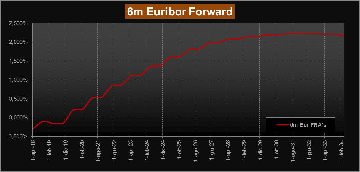 Poco mossi i forward su Euribor 6 mesi, in accordo con i movimenti della ZC-Yield Curve: anche qui osserviamo una maggiore reattività sul tratto a lunga che si porta poco sotto area 2,30% mentre siamo di fatto fermi sul tratto a breve conseguentemente alle attese per una BCE “morbida” ancora per qualche tempo.