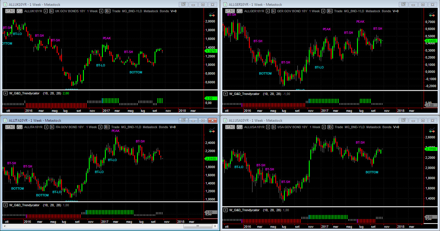 Osservando – a livello di analisi integrata – le curve dei rendimenti dei benchmark decennali dei principali mercati, si osserva una situazione non omogena: mentre sui governativi UK e USA è piuttosto evidente e stabile la ripresa del trend al rialzo dei rendimenti (per cui prezzi dei bond in discesa), sui governativi tedeschi e – in particolare – su quelli italiani, la situazione grafica è meno netta. Pur essendo chiaramente inseriti in un canale rialzista dai minimi di luglio 2016 pare che la correzione contro-trend sia maggiormente sviluppata e duratura sui mercati area Euro. La view e l’ipotesi di base comunque non cambia al momento: la ripresa del trend primario ribassista sui bond è in fase di sviluppo.