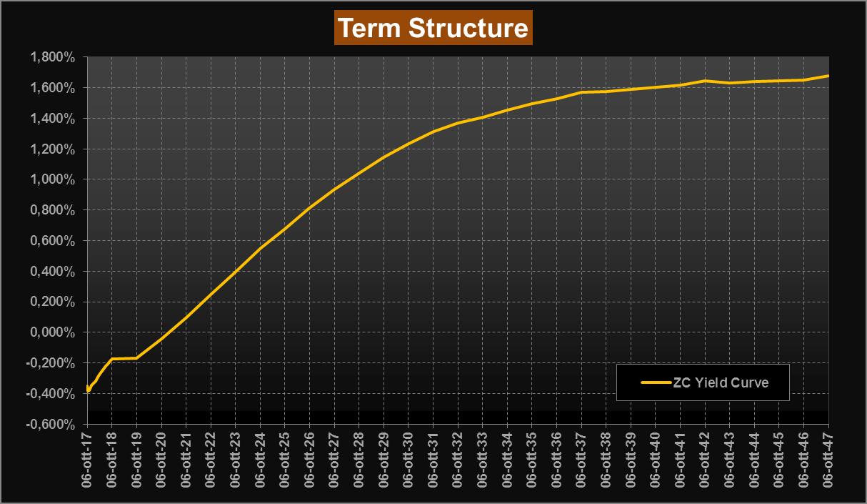 La ZC-Yield Curve riprende ad allargare leggermente rispetto all’ultima rilevazione, con i rendimenti sul tratto a lunga che si avvicinano ad area 1,70%. Più stabile la parte a breve che continua a fornire indicazioni su attese per una politica monetaria BCE “morbida” anche nel 2018. Come dicevamo già nella scorsa analisi, la variazione più rilevante, da mesi a questa parte, è sul tratto a lunga che ha perso la connotazione piatta che lo caratterizzava da molto tempo, per assumere ora un’inclinazione positiva, confermata anche in questa rilevazione. A distanza di una settimana circa, l’esito delle elezioni in Germania non ha impattato pesantemente sulla curva, ma ha certamente contribuito al rialzo dei rendimenti; confermato invece l’impattato sul cambio EUR/USD che ha testato 1,17 e ora viaggia poco sotto area 1,18.