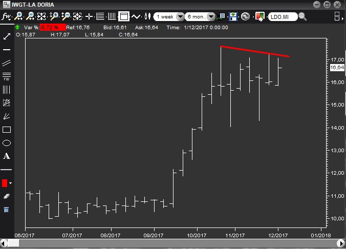 durante l'analisi del weekend alla ricerca di occasioni di acquisto sui mercati blue chips e mid cap mi è sfuggito il titolo La Doria, che si trova in una situazione piuttosto interessante. C'è infatti una trendline sfruttabile, e in caso di breakout avremmo una proiezione di prezzo al massimo storico del titolo. Vediamo il grafico:
