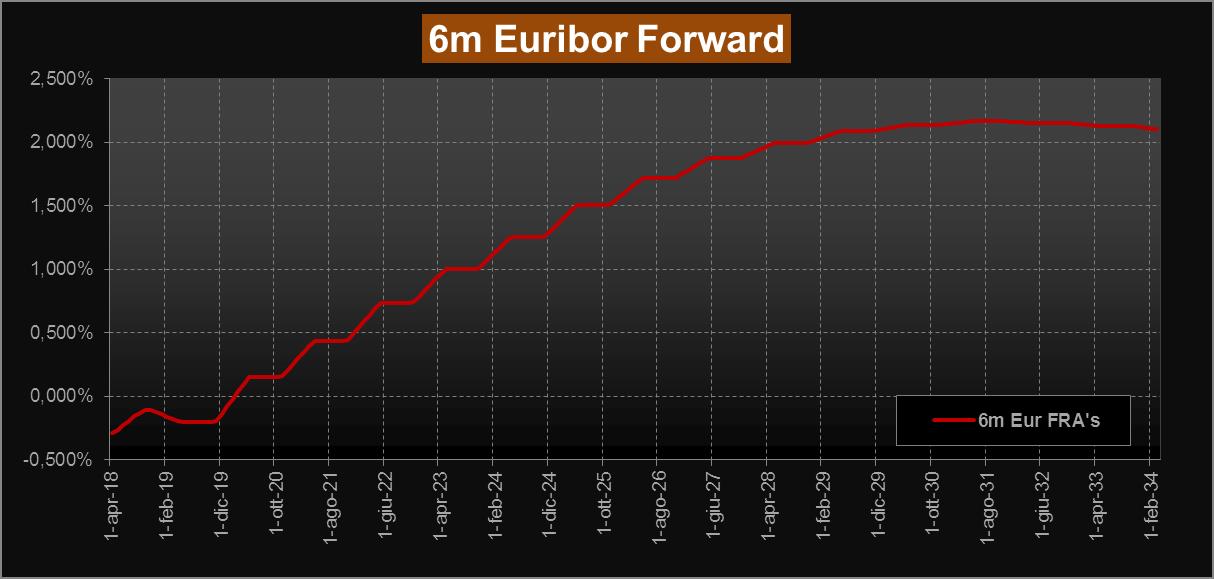 Stabile la parte a breve della ZC-Yiel Curve e quindi poco mossi anche i forward su Euribor 6 mesi, con il tratto a lunga che si porta sotto area 2,20% e il tratto a breve che conferma tassi ancora bassi e politica accomodante.