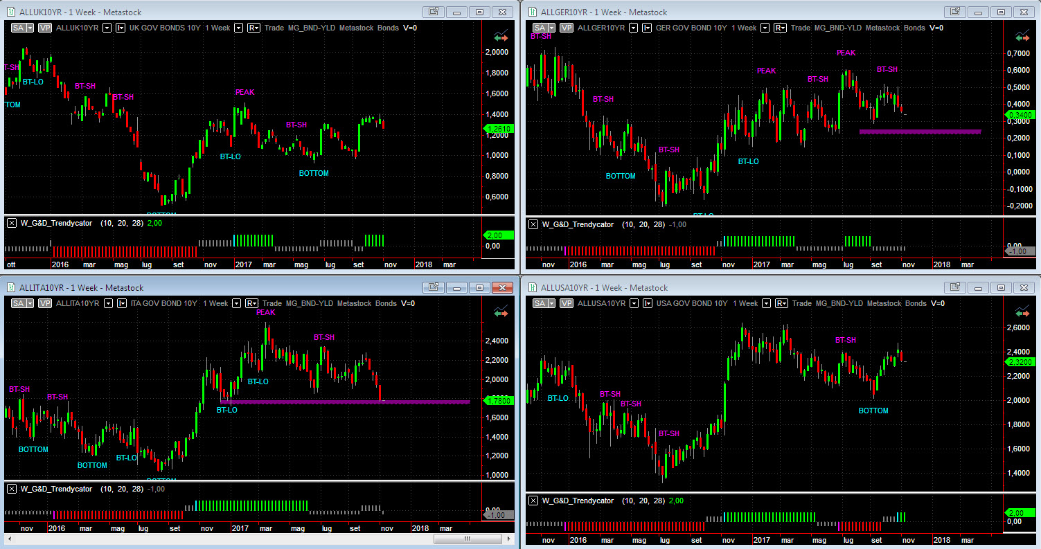 Osservando – a livello di analisi integrata – le curve dei rendimenti dei benchmark decennali dei principali mercati, diventa sempre più netta la profonda differenza tra le aspettative sui tassi nell’area USA/UK rispetto all’Europa. Il modello infatti sta confermando i BOTTOM sui decennali USA e UK, poiché ora Trendycator è verde e quindi esprime trend al rialzo. Situazione opposta in area Euro, ove il Bund pare diretto in area 0,30% di rendimento e il Btp addirittura sta provando a bucare l’area 1,75% che regge da fine 2016.