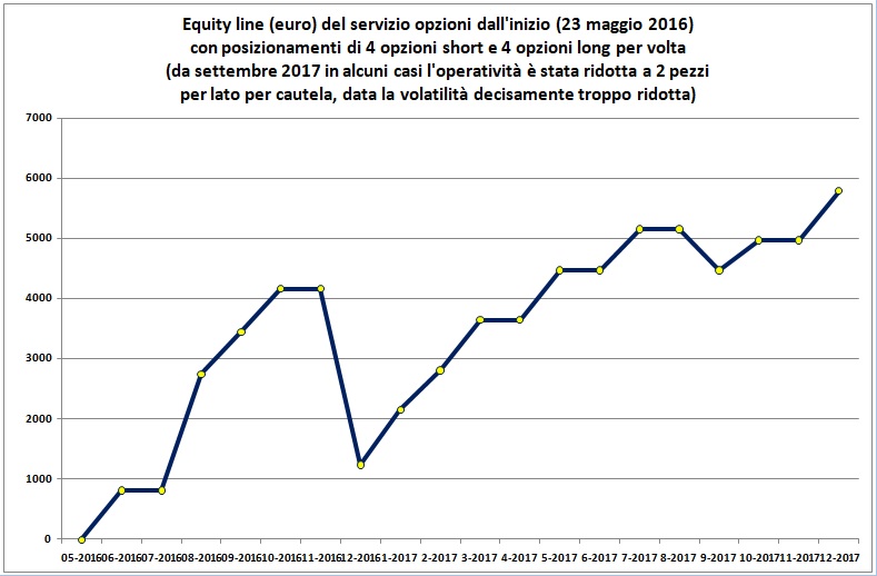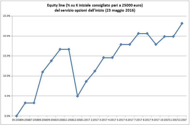 oggi è giorno di scadenza e quindi le posizioni che avevamo aperto a metà novembre sono scadute, portandoci profitto pieno, in linea con le aspettative. Segniamo così oggi con piacere un nuovo massimo storico dell'equity line del servizio opzioni: