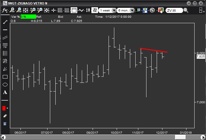 A essere sinceri non mi piacciono le conformazioni così a imbuto come quella su Zignago, ma il target originato dalla più bassa delle chiusure è ben diverso da quello generato dal minimo dei minimi, perciò si può anche provare. Lotto molto piccolo, essendo lo stop molto lontano.