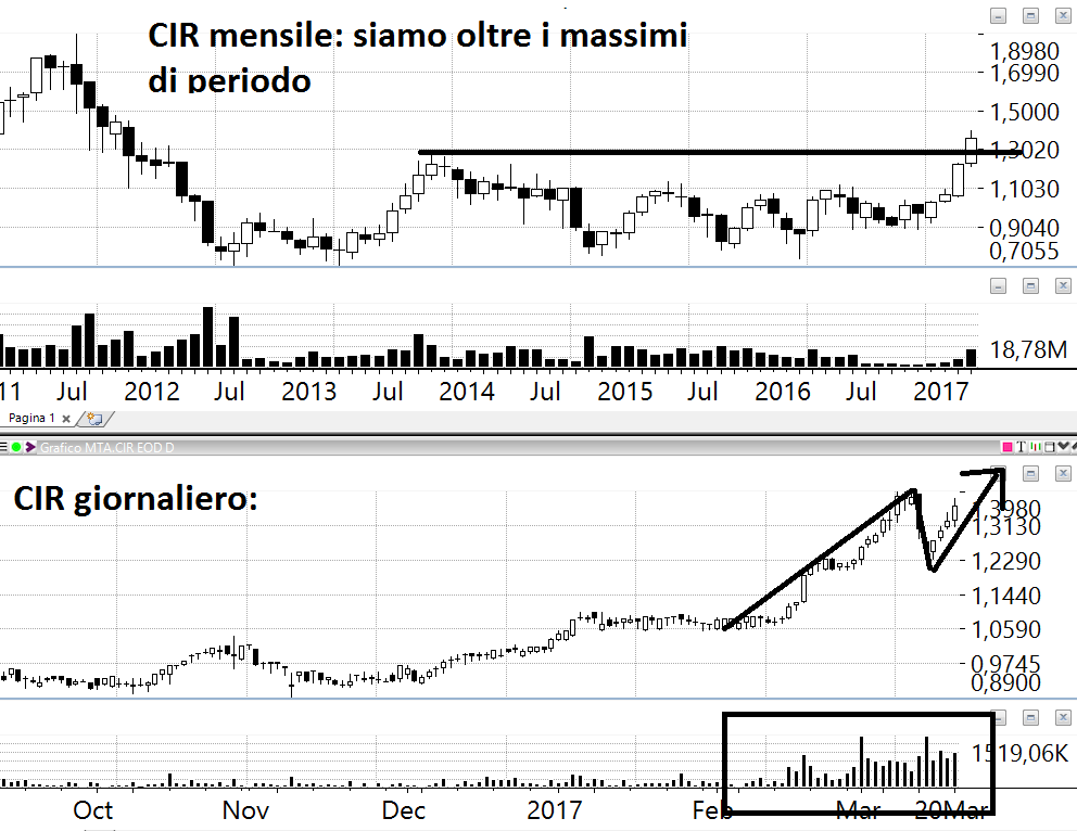 CIR: i volumi ci sono, il breakout sul mensile c’è, abbiamo avuto lo sciacquone e ora di nuovo stiamo vicini ai massimi. Dobbiamo andare, guardate i volumi: buy ufficiale 1,38 stop;