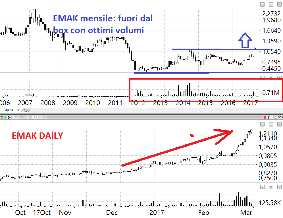 EMAK: ecco questo titolo spiega bene cosa intendevamo prima relativamente alla vecchia guardia di IMA e Interpump. Emak ha tutti i conti in ordine e si è espansa negli ultim anni aumentando il fatturato di un terzo buono e mantenendo una redditività STABILE (che è la cosa che ci piace) anche se moderata (Roe al 6%) nonostante la fase buia dell’economia. Ora sembra quotare al fair price ma questo non significa che possa decuplicare. A livello tecnico siamo in una fase conclamata di bottom up concluso e quindi si può solo comprare non appena ce ne darà l’opportunità.