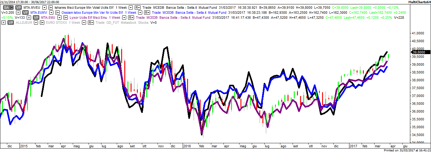 Come sempre un grafico parli più di tante parole, e in questo grafico ho sovrapposto l'indice Stoxx 600 in barre settimanali e l'ETF Lyxor MSCI EMU (DR) UCITS ETF in viola dove si vede una attinenza perfetta tra ETF e sottostante; poi in nero e blu i due etf a strategia minimum variance fra i più longevi.